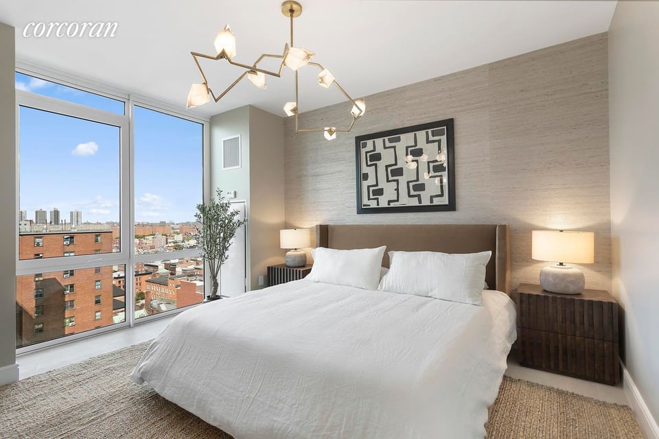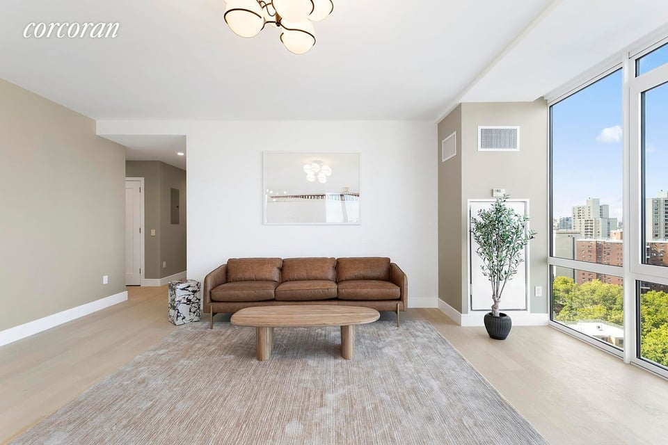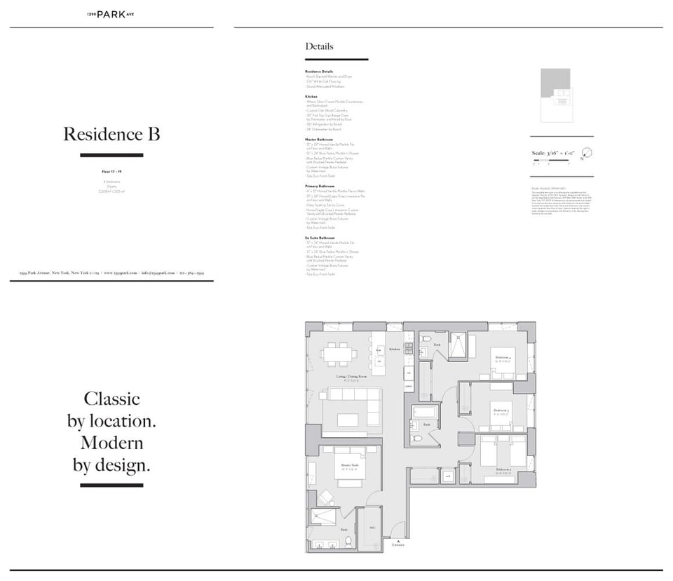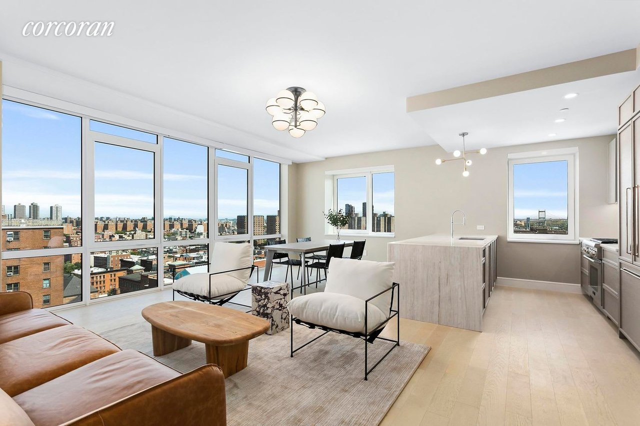 Immediate occupancy! Residence 19B at 1399 Park Ave is a spectacular corner four-bedroom, three-bath home featuring 9' ceilings, floor-to-ceiling windows and wide plank white oak flooring throughout. The sprawling living/dining space is perfect for entertaining and offers incredible open city views. Luxuriously custom designed by Whitehall Interiors, the large open plan kitchen with pantry is outfitted with Athens silver cream marble slab island, countertops and backsplash, custom oak cabinetry with stainless steel appliances. The spacious Master suite is complete with excellent closet space and an en-suite bath. The bathrooms features honed vanilla marble tile walls, eagle grey limestone flooring and a brushed pewter pedestal vanity, finished with vintage brass fixtures by Watermark and a deep soaking tub by Zuma. A powder room off the entry features a single floor-to-ceiling slab of Honed Calcutta Manhattan Marble, full-length mirror adorned with Brass Pendants by Lee Broom, Honed Eagle Grey Limestone floors. A Bosch washer/ dryer completes the space. At the crossroads between modern and classic is 1399 Park Avenue. Rising 23 stories, this 72-unit glass and architectural-grade concrete tower takes the best of this prestigious avenue and merges it with a thoroughly modern lifestyle. The contemporary lobby greets residents with its soaring double-height ceiling and feature wall clad in rare Honey Onyx. The amenities at 1399 Park perfectly suit your every need and want, including a 24-hour doorman, one-of-a-kind playroom complete with ball pit and rock climbing wall, state-of-the-art fitness center, residents lounge including 1,300 sq. ft. of outdoor space with built-in grills by Wolf, library with fireplace, cold and dry storage, bike room and on-site parking. Classic by Location. Modern by Design.