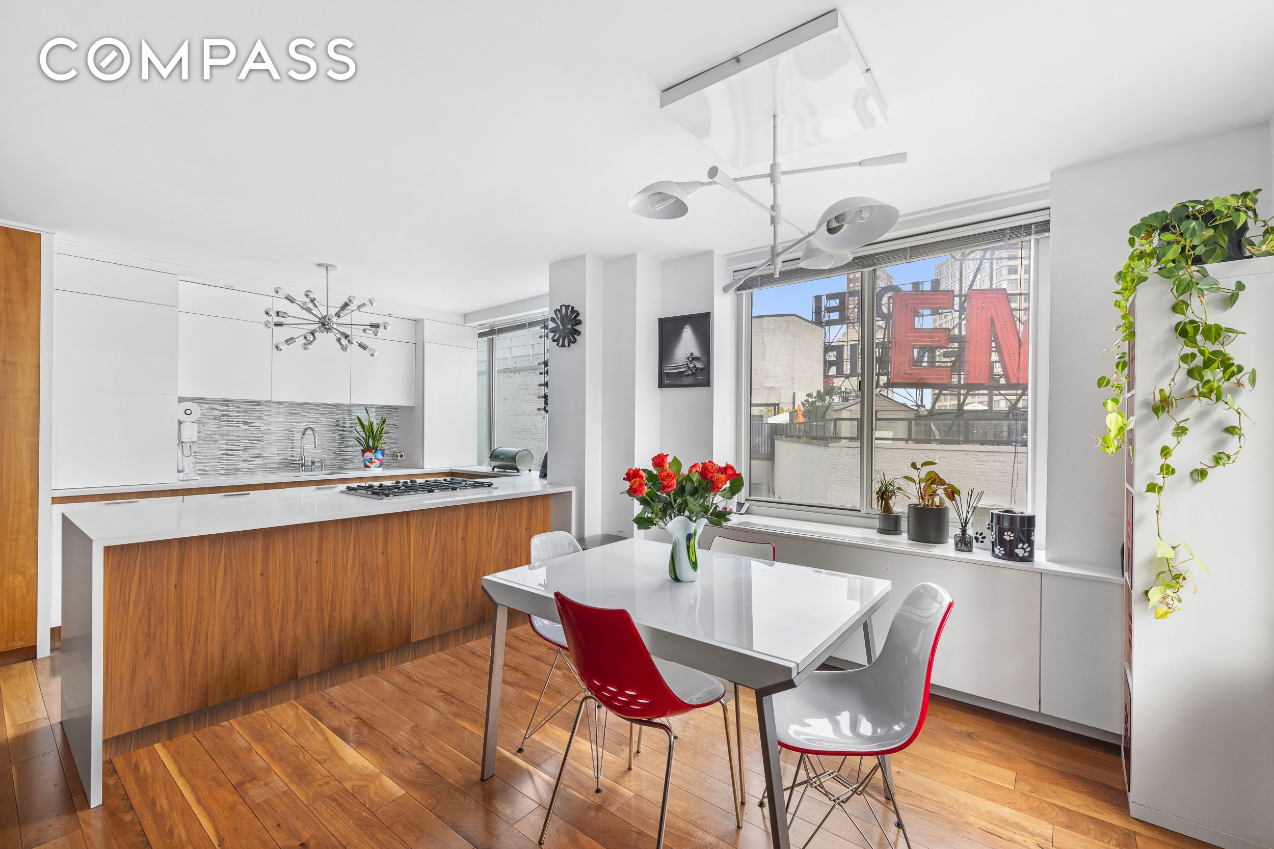 As one of the only lines in the building with a private balcony, this residence offers a rare indoor-outdoor element, complemented by upgraded windows for enhanced quiet and comfort. A defined vestibule area provides an ideal work-from-home setup, and multiple closets support easy, organized living. A custom-built Murphy bed is seamlessly integrated into the living space, offering a refined solution for hosting guests without sacrificing everyday functionality.